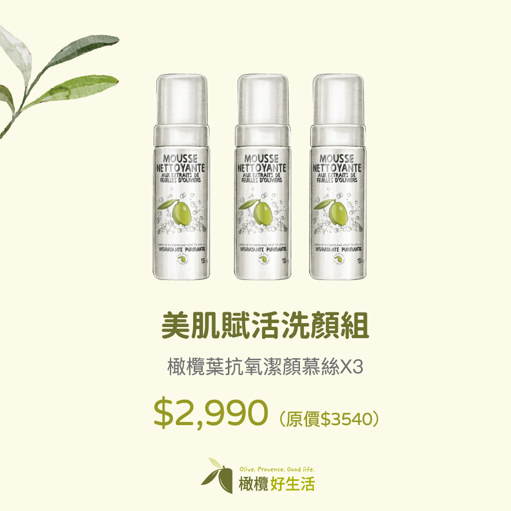 一顆橄欖【美肌賦活洗顏組】限時優惠!內含橄欖葉抗氧潔顏慕絲3瓶,細緻綿密的泡沫能溫和清潔肌膚,洗後保有柔潤不緊繃的舒適感。以植物性成分為基底,不含塑膠微粒與礦物油,適合每日使用。天然橄欖葉萃取,帶來清新香氣與輕盈洗感,讓清潔也成為一種療癒享受。