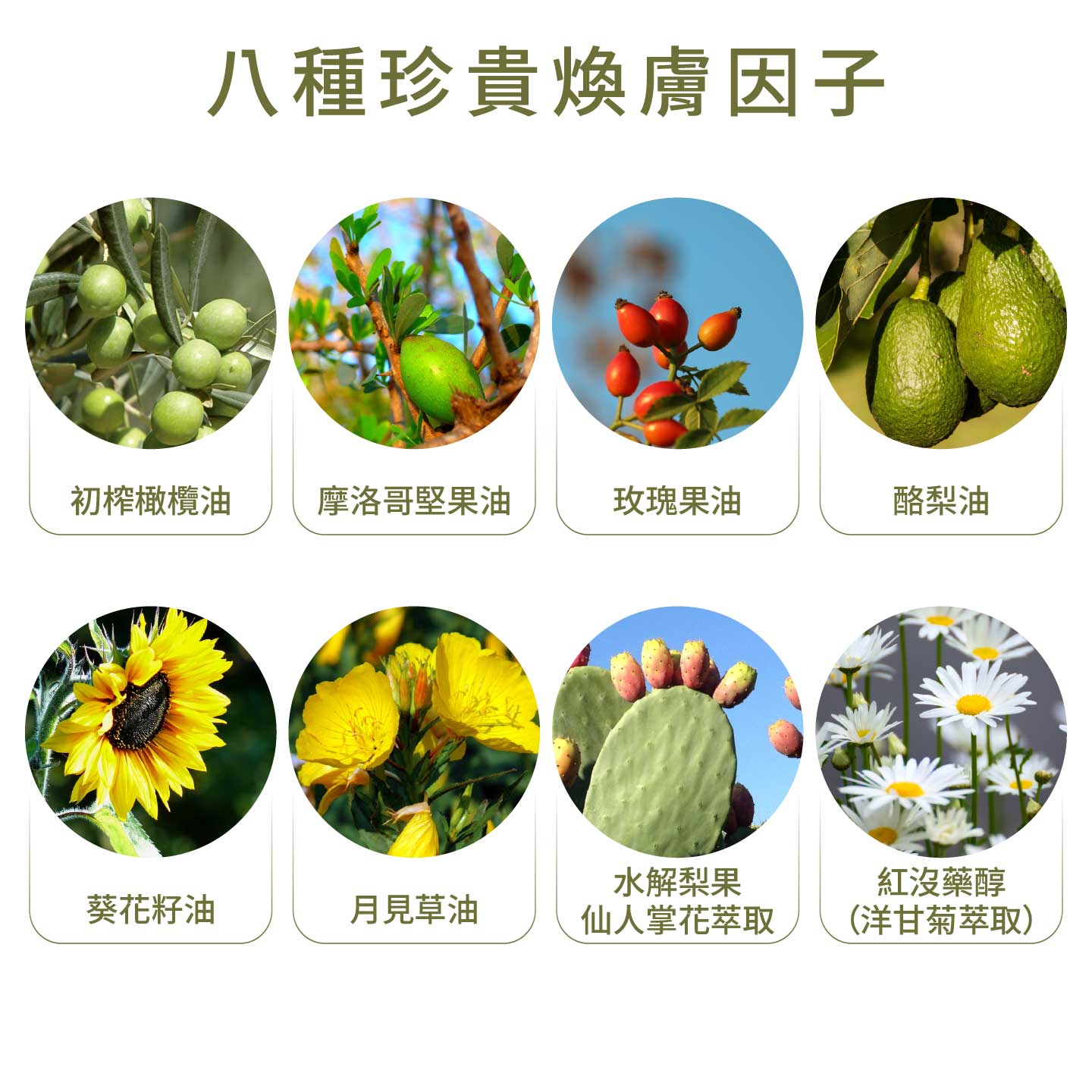 賦活肌膚的植萃之選匯聚八種珍貴煥膚因子,包括初榨橄欖油、摩洛哥堅果核仁油、玫瑰果油、酪梨油、葵花籽油、水解梨果仙人掌花萃取物、沒藥醇等,組成獨特秘方。初榨橄欖油與多種植物油完美調和,為您的肌膚帶來卓越的水油平衡保養體驗;含有摩洛哥堅果油、玫瑰果油、酪梨油、月見草油等珍貴植物油成分,提供滋潤,使肌膚充滿活力;梨果仙人掌花萃取物蘊含多種礦物質、氨基酸及黏多醣,恢復肌膚彈性,維持肌膚水嫩飽滿;添加沒藥醇與茶樹萃取,具有舒緩膚質的功效,為您的肌膚提供柔和呵護。