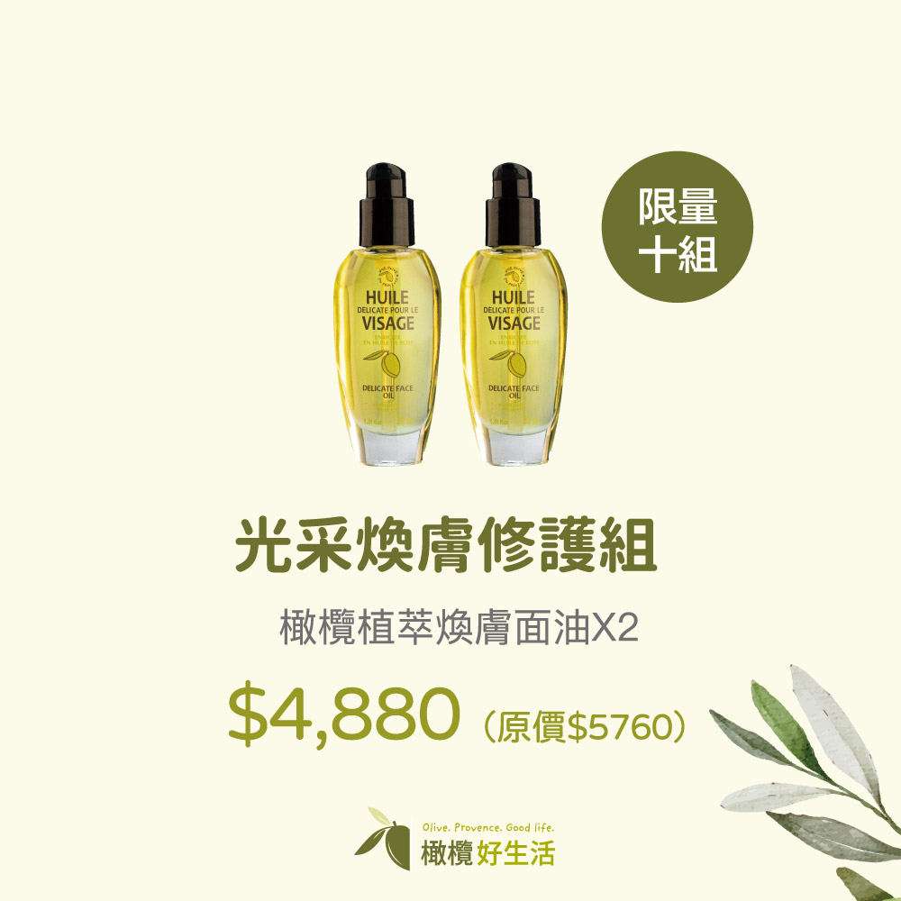 一顆橄欖【光采煥膚修護組】,嚴選兩瓶橄欖植萃煥膚面油,富含天然植物油與維他命E成分,質地輕盈、吸收迅速,為肌膚帶來柔嫩與潤澤的細緻觸感。無添加塑膠微粒與人工香料,純淨天然配方讓保養更安心。